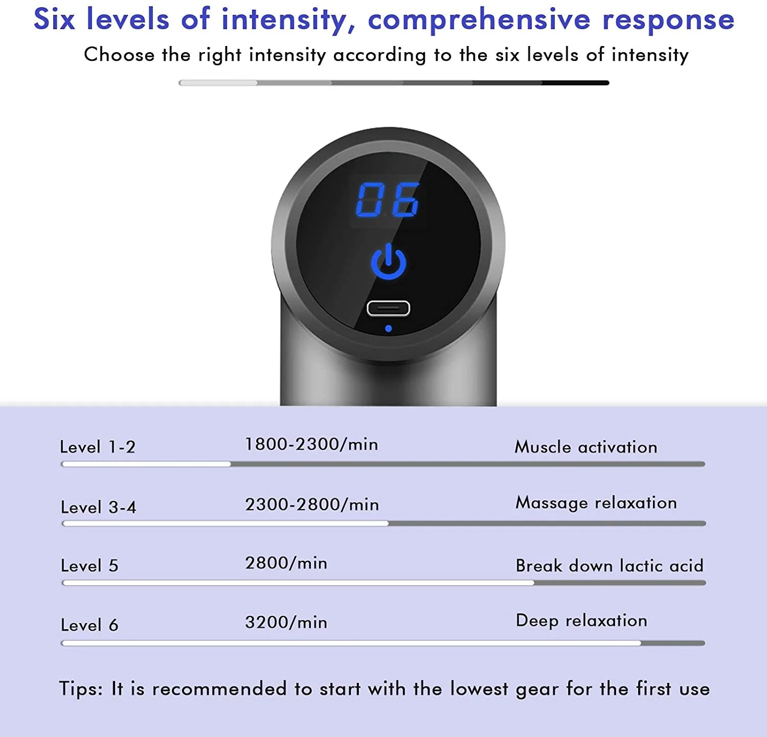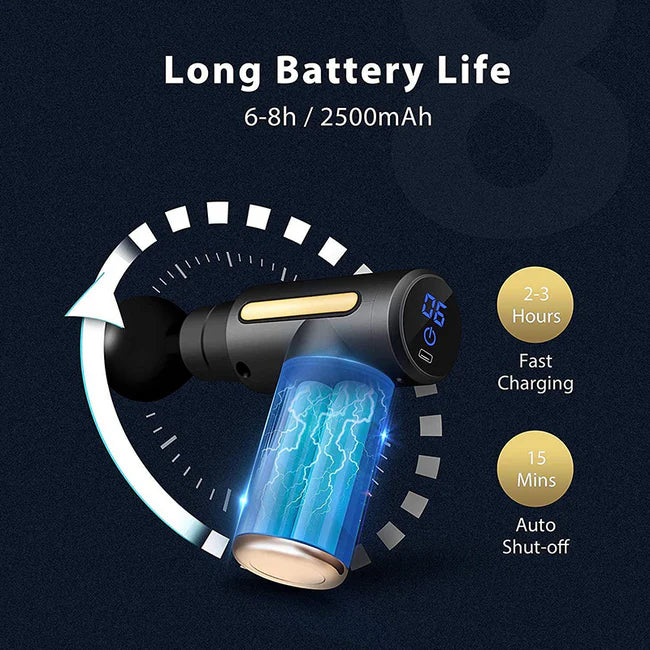 【Low decibels and better battery capacity】With the newest noise reduction technology, it provides silent and intense massage.1800mAh, lithium-ion rechargeable battery, delivering up to 3, 200 percussion per minute. It works up to 6 hours in full charge condition.