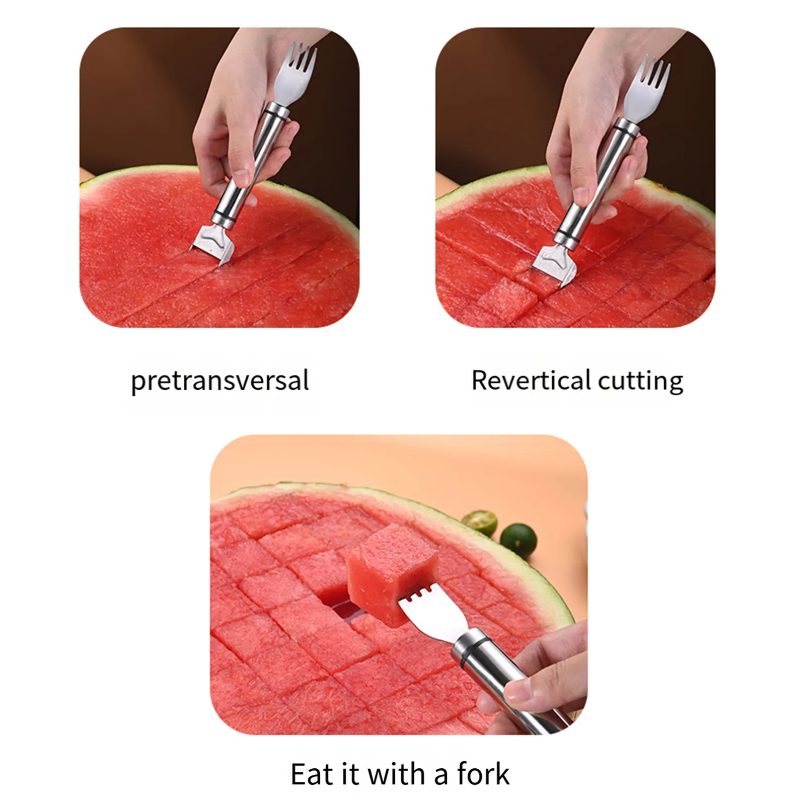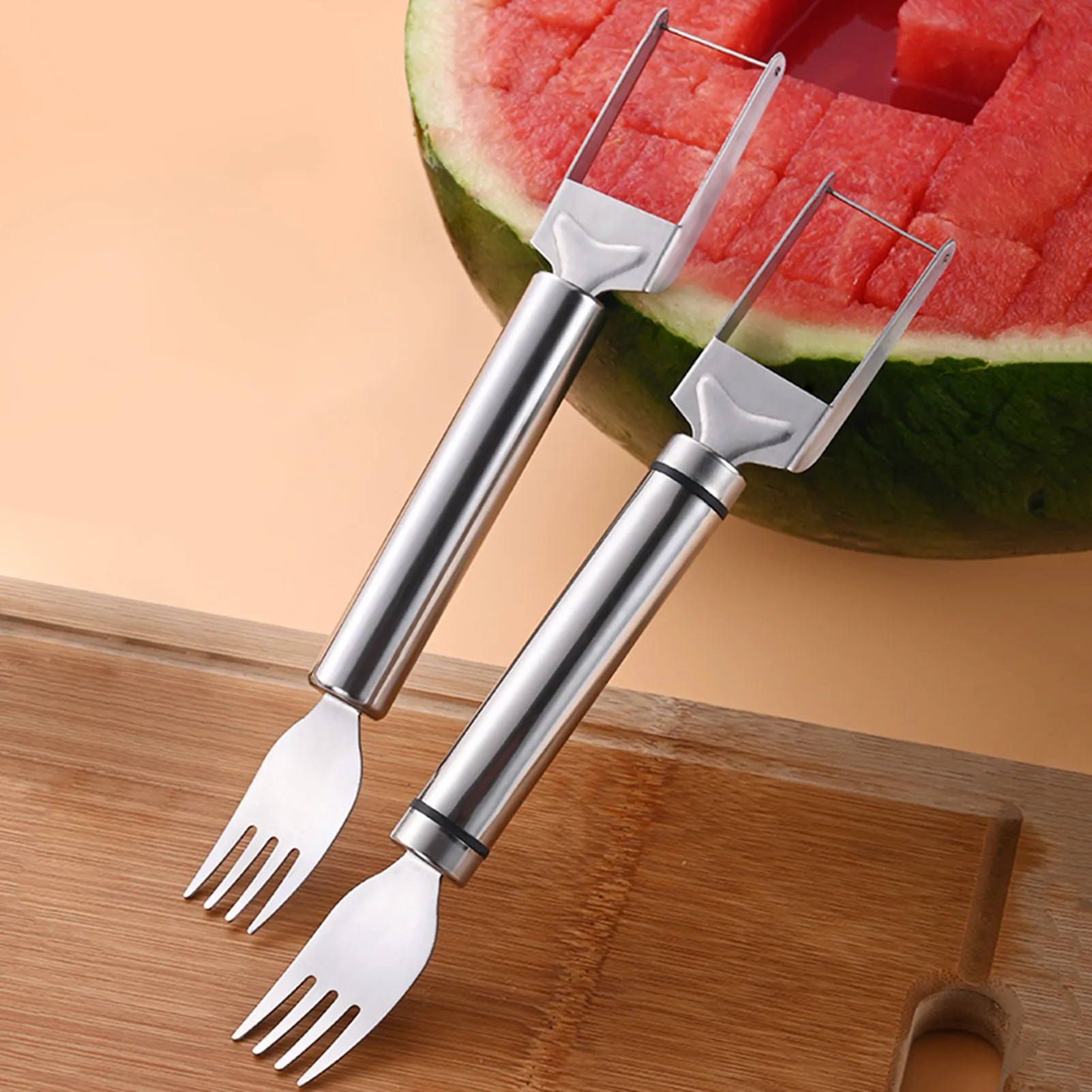 Product details of Quorrae Stainless Steel Fruit Fork 2-in-1 Stainless Steel Watermelon Slicer Fork Easy Fruit Cutter Tool for Summer Kitchen Gadgets for Kitchen Watermelon Slicer
